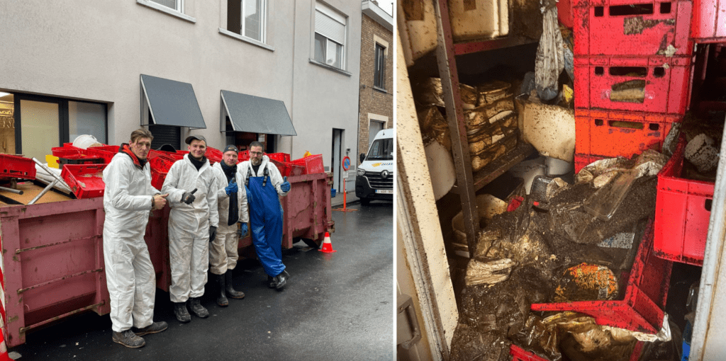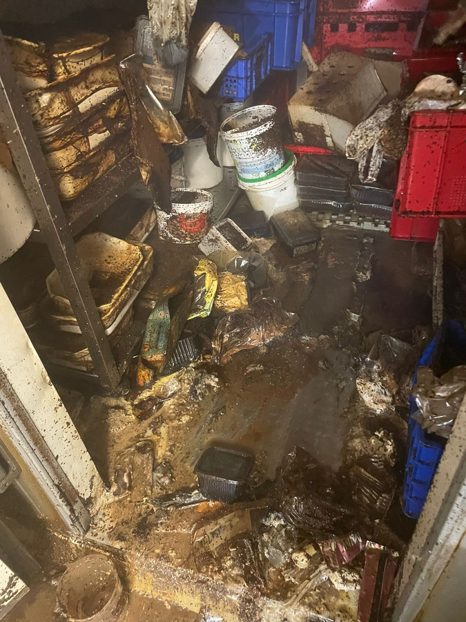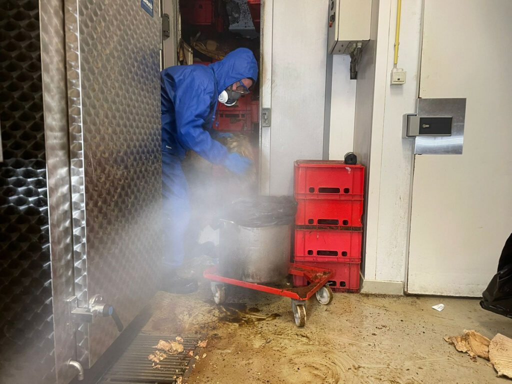 Het vlees is sinds gisteren weggehaald. “De bedoeling was om de containers te laten staan tot we klaar waren, maar dat kon niet. De geur was te fel, en de buurtbewoners kwamen zelfs al klagen. Dus hebben we de containers met vlees eerder weggehaald. Vandaag ontsmetten we nog het hele gebouw, en dan zit het erop. Dan hebben met zijn vieren vier dagen gewerkt aan de opkuis.”